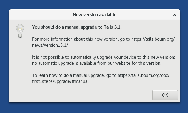 If you cannot upgrade at startup, you can open Tails Upgrader later by choosing Apps ▸ Tails ▸ About Tails and clicking Check for Upgrades.